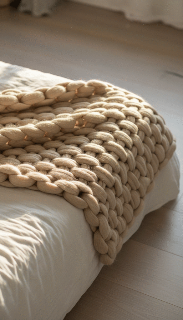 Weighted blankets provide deep pressure stimulation that mimics a hug, helping to calm the nervous system. The chunky knit variety offers this soothing weight without trapping excess body heat like traditional weighted beads. The open weave allows for maximum airflow, making it perfect for year-round use. It adds a sculptural, modern aesthetic to the foot of your bed.