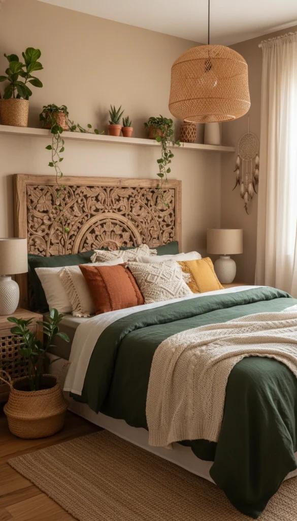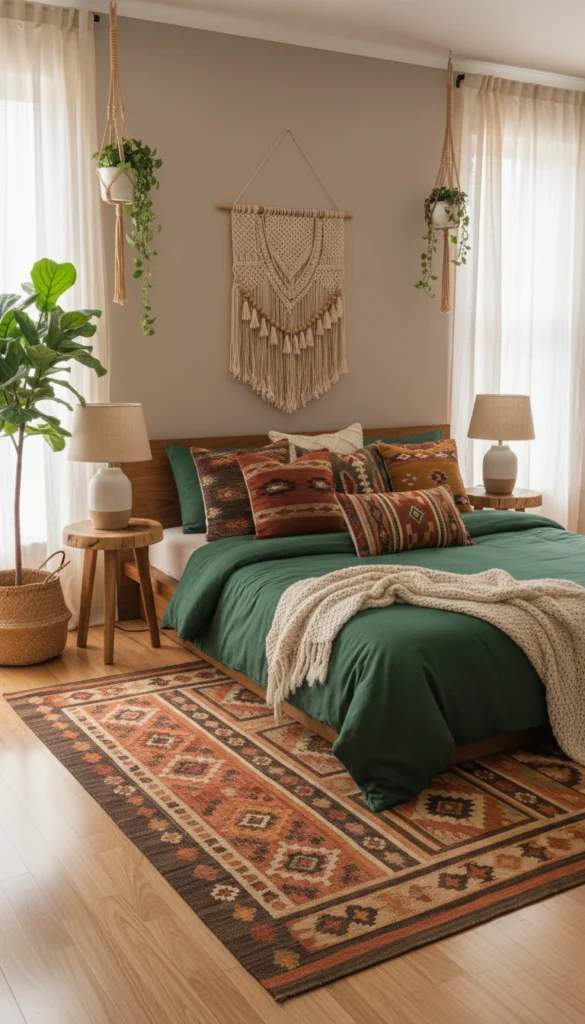 Deep green is a hero color in an earthy boho bedroom.