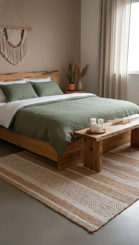 - Linen or washed cotton bedding in green, taupe, or clay