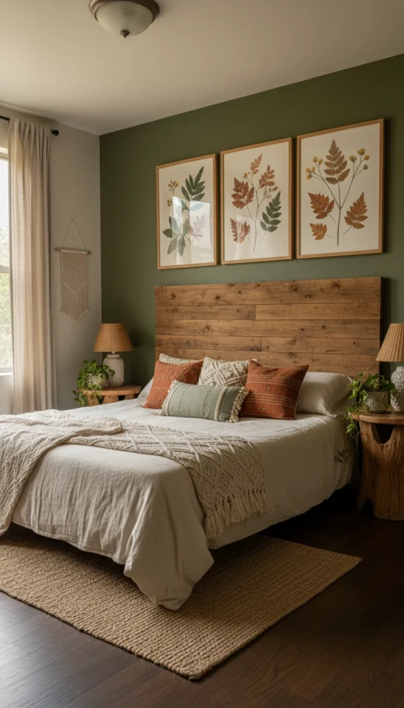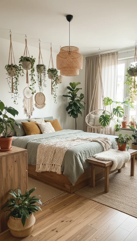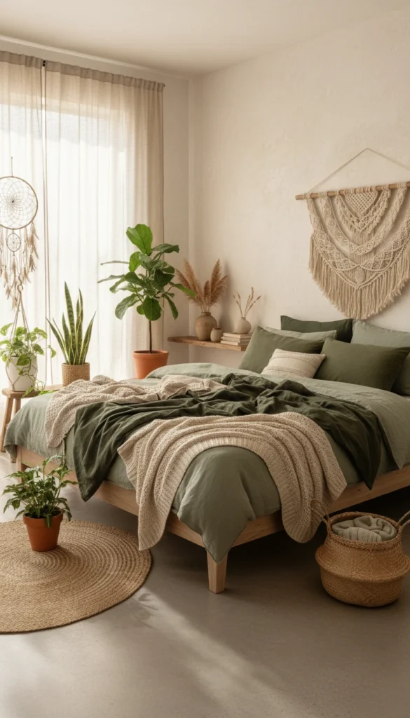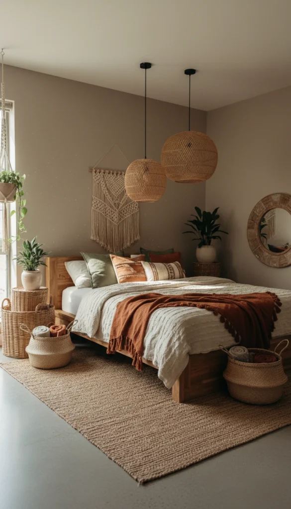 A cozy, earthy boho bedroom wraps you in soft textures, warm light, natural materials, and a hint of “I live in a plant-filled cabin somewhere peaceful.”