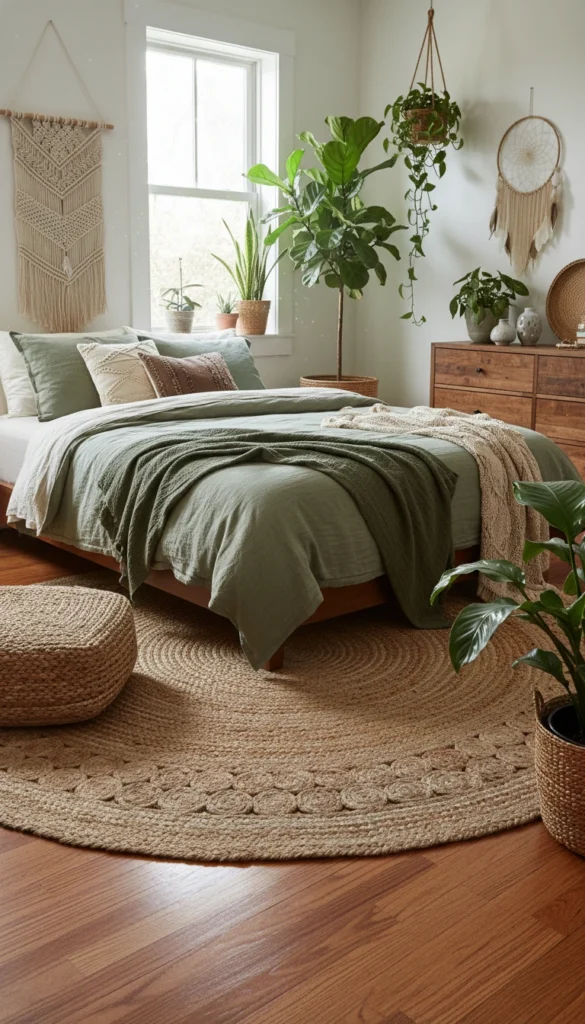 Natural fibers like jute, sisal, and wool fit perfectly with an earthy boho style.
