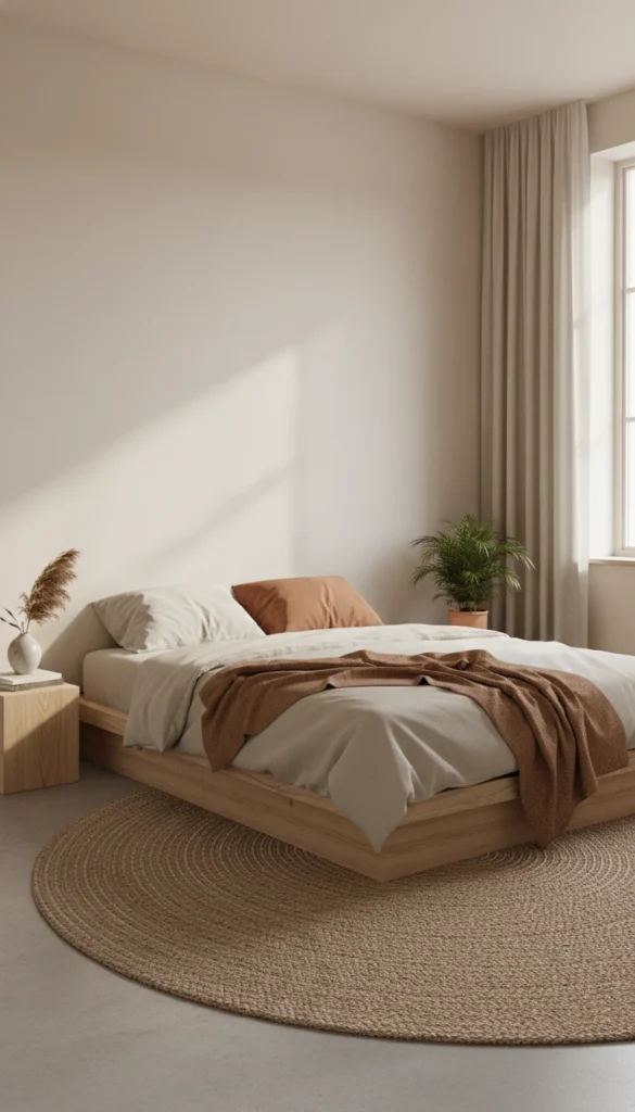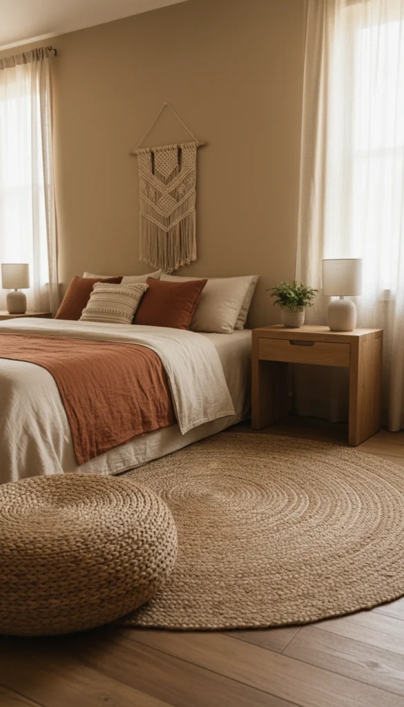 A big jute, sisal, or seagrass rug anchors the whole bedroom and instantly adds that earthy, grounded feeling. These fibers bring in the color of dried grasses and soil, which pairs beautifully with warm walls and bedding.