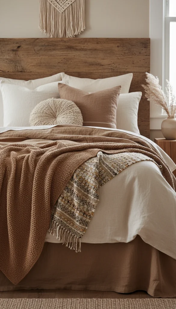 Use layering to create depth without chaos. For example: natural linen sheets, a beige duvet, a rust throw blanket, and a mix of pillows in ivory, caramel, and olive. You’re building a landscape of color and texture.