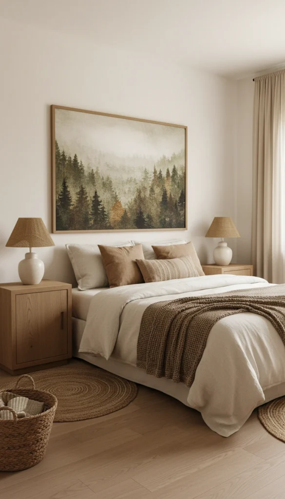 Think of this as the “quiet base” of your earthy bedroom. Warm neutrals—soft beige, oatmeal, light caramel—create a soothing canvas that instantly calms the room. They’re easier on the eyes than stark white or cool gray and feel much closer to natural elements like stone and sand.
