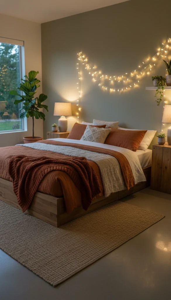 Earthy bedrooms rarely rely on a single overhead light. Instead, they use multiple low, warm light sources that mimic candlelight or sunset. Think wall sconces, table lamps, and string lights in soft amber tones.