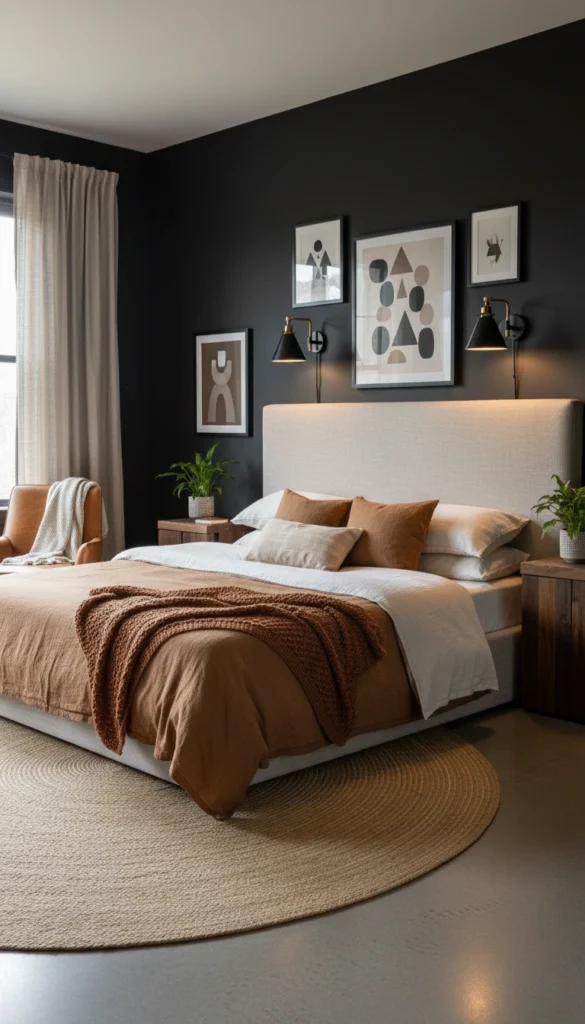 Earthy tones can feel a bit too soft if everything is beige and muted. A touch of black or deep charcoal adds structure and keeps the space from looking washed out.