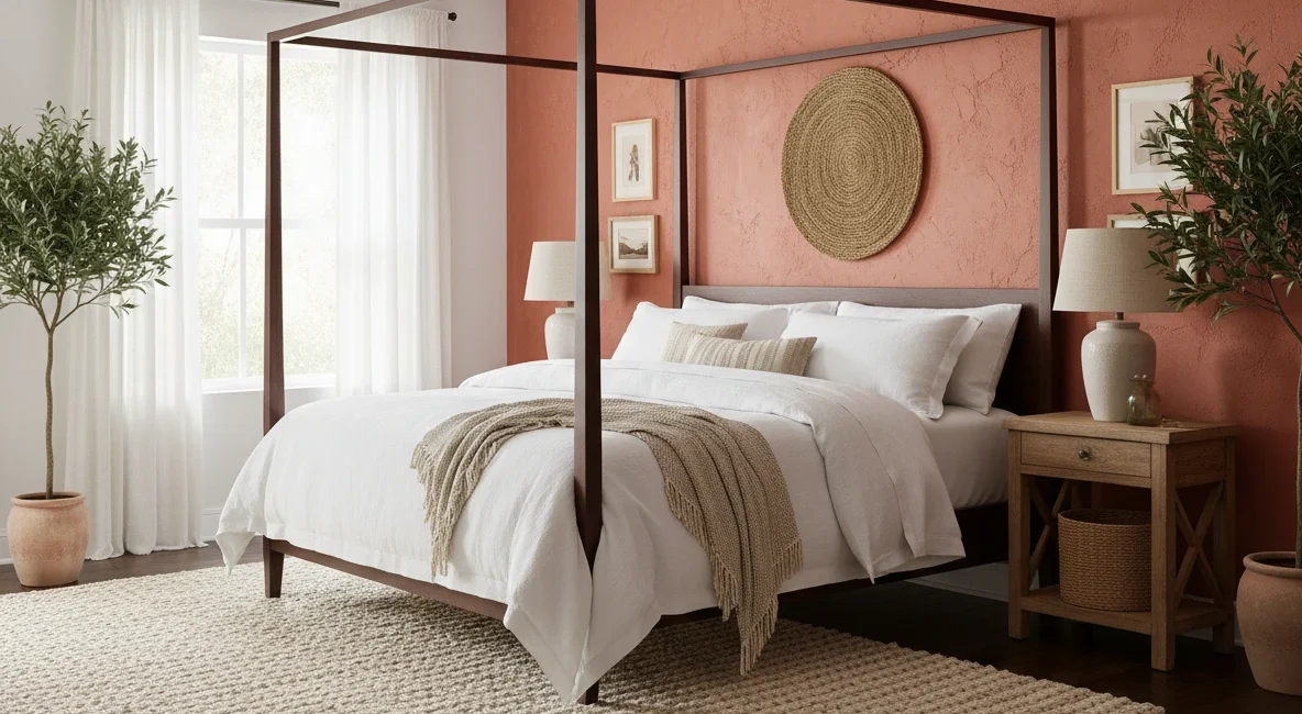 Terracotta, rust, and clay tones bring a sun-warmed feel to the bedroom. They mimic baked earth, pottery, and sunset light—all things that make a room feel welcoming and grounded.