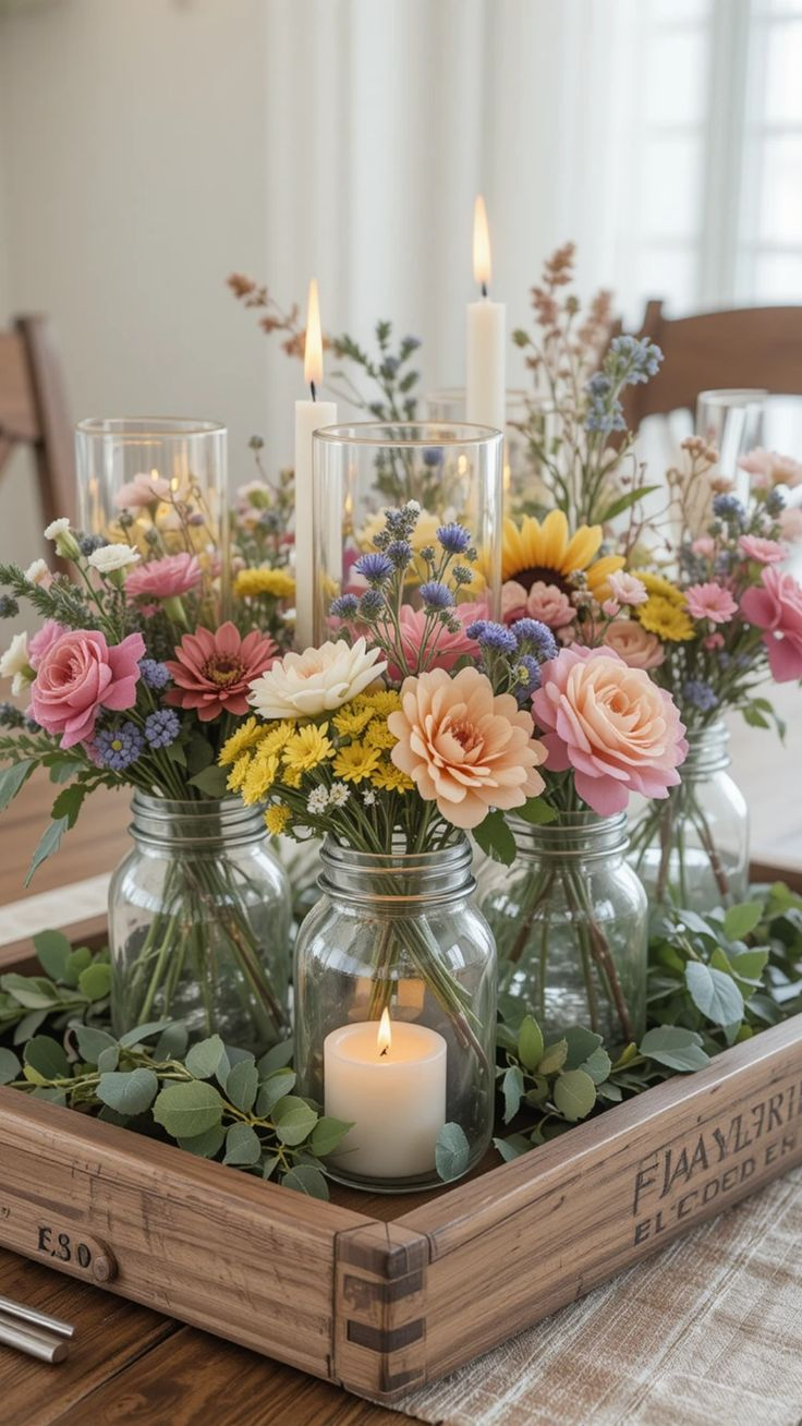 These centerpieces work well for everyday dining or small gatherings. They can be refreshed easily by swapping flowers or adding seasonal accents.