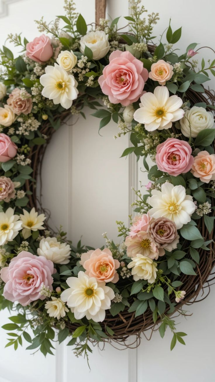 A spring wreath like this instantly brightens your entry and sets a warm, welcoming tone before anyone even steps inside. The soft florals, natural greenery, and balanced shape make it feel fresh, cheerful, and timeless.