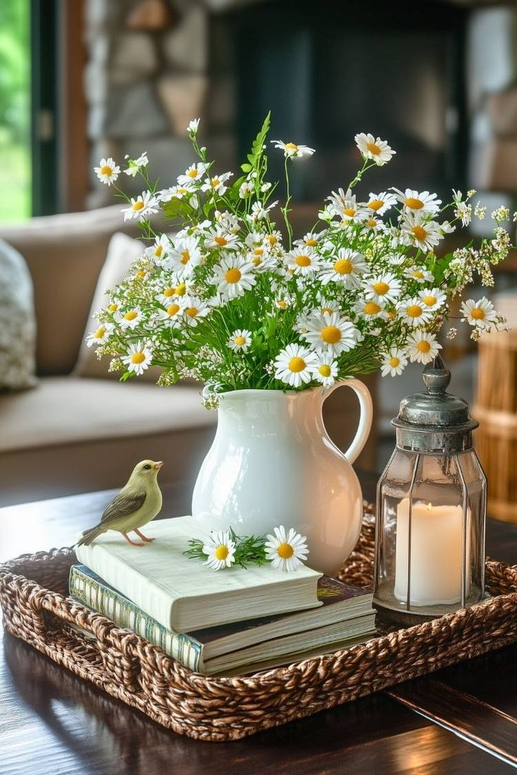 Use a simple pitcher or ceramic vase filled with fresh or faux daisies. Their relaxed shape adds movement and keeps the display light and cheerful.