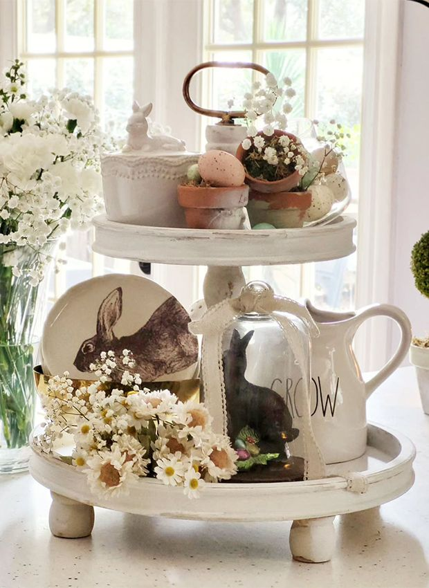 A white or lightly distressed tiered tray keeps the look soft and allows decorative pieces to shine without feeling busy.