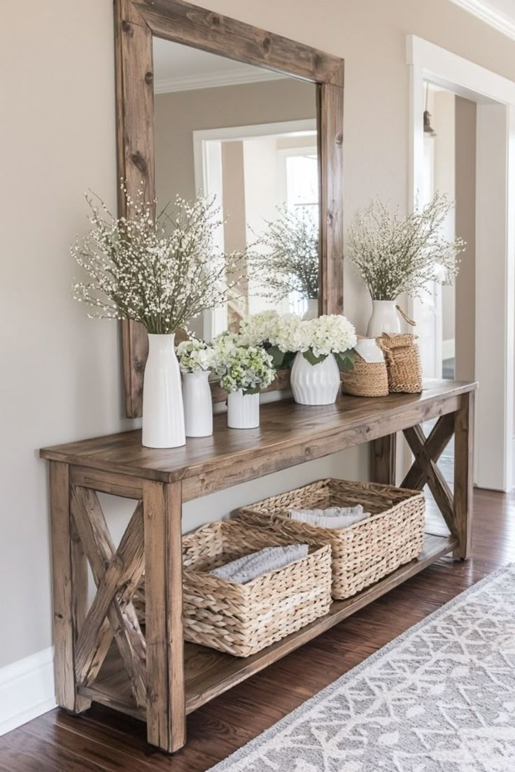 This entryway feels calm, welcoming, and beautifully balanced. The mix of natural wood, soft florals, and gentle symmetry creates a warm first impression that instantly sets the tone for the rest of the home.