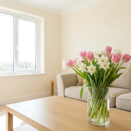 Small arrangements on coffee tables or windowsills bring color and life without overwhelming the room. Spring blooms like daffodils or cherry blossoms work beautifully.
