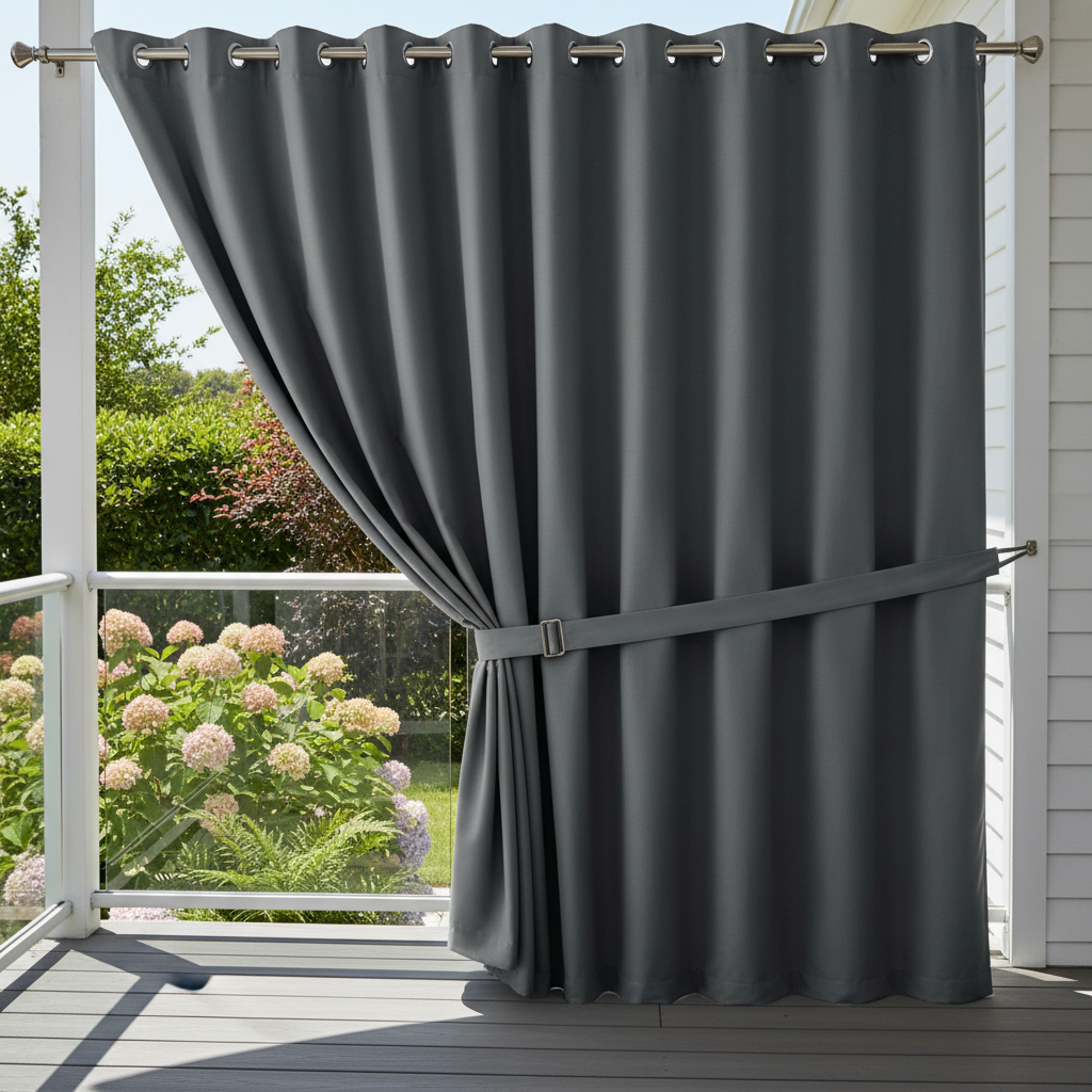 These curtains are excellent for those seeking a practical yet stylish option that can withstand the elements. They offer significant coverage and can be drawn completely for maximum seclusion or light control.