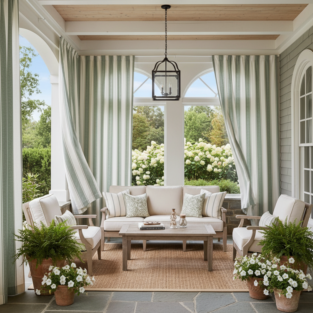 Darker curtains are ideal for urban porches or spaces requiring maximum seclusion and a dramatic design statement. They create a cozy, den-like feel, perfect for evening relaxation or intimate gatherings.