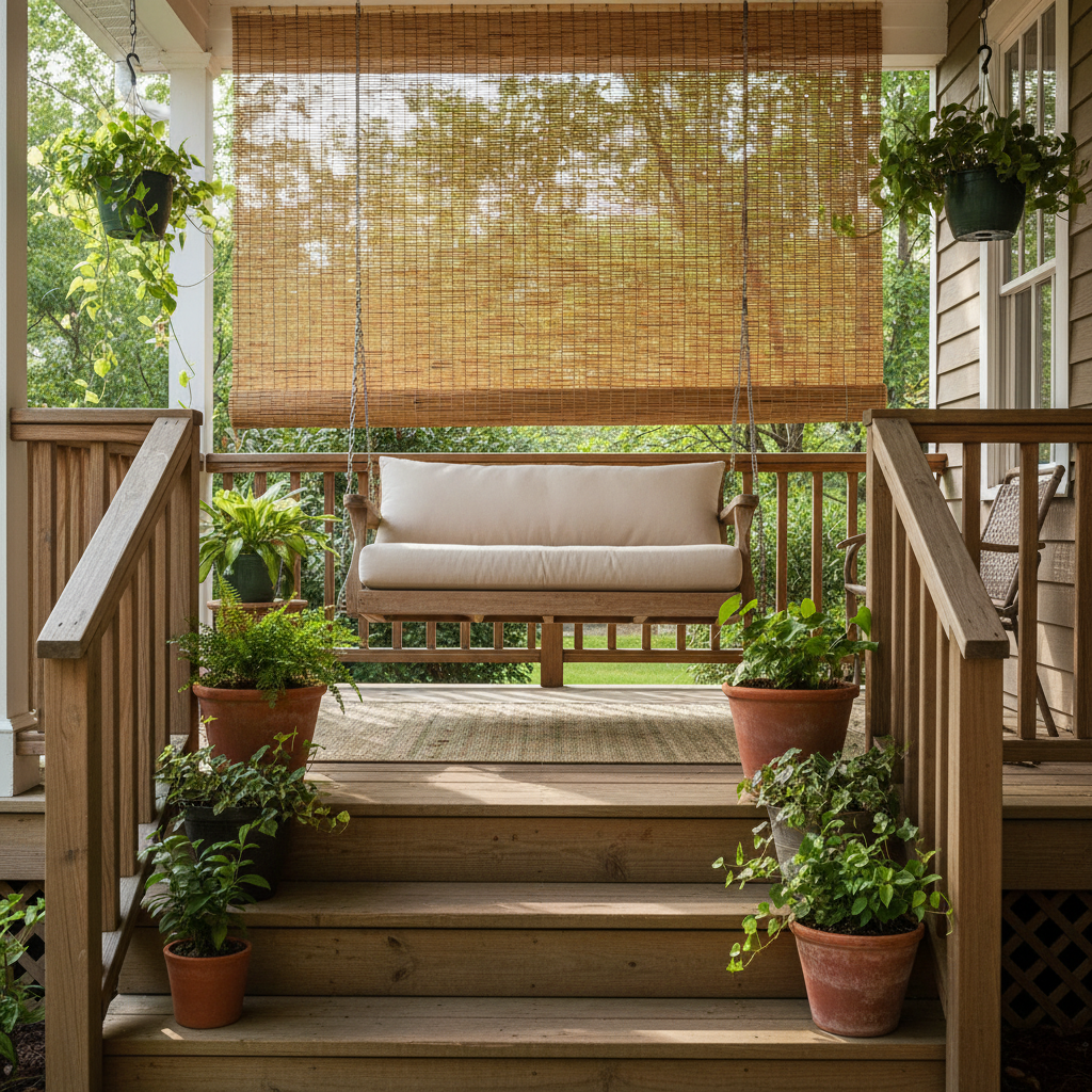 Bamboo roll-up shades introduce a natural, organic texture, bringing an earthy warmth to your porch decor. They offer adjustable light filtration and privacy, allowing you to easily control the amount of sun entering your space.