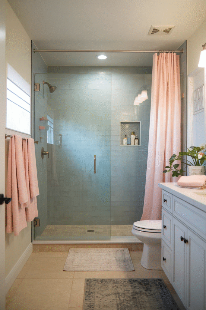 This approach works best when you’re committing to a color story for the entire bathroom. The tinted glass and colored curtain become anchor pieces that inform your choices for towels, rugs, and accessories.