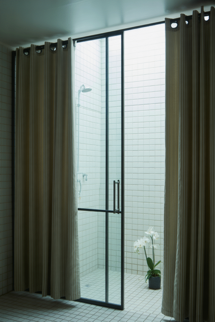 Sliding glass shower doors are practical for tight spaces, but they can feel a bit utilitarian. Soften them by installing curtain panels on either side—not across the opening, just flanking it like you would frame a window.