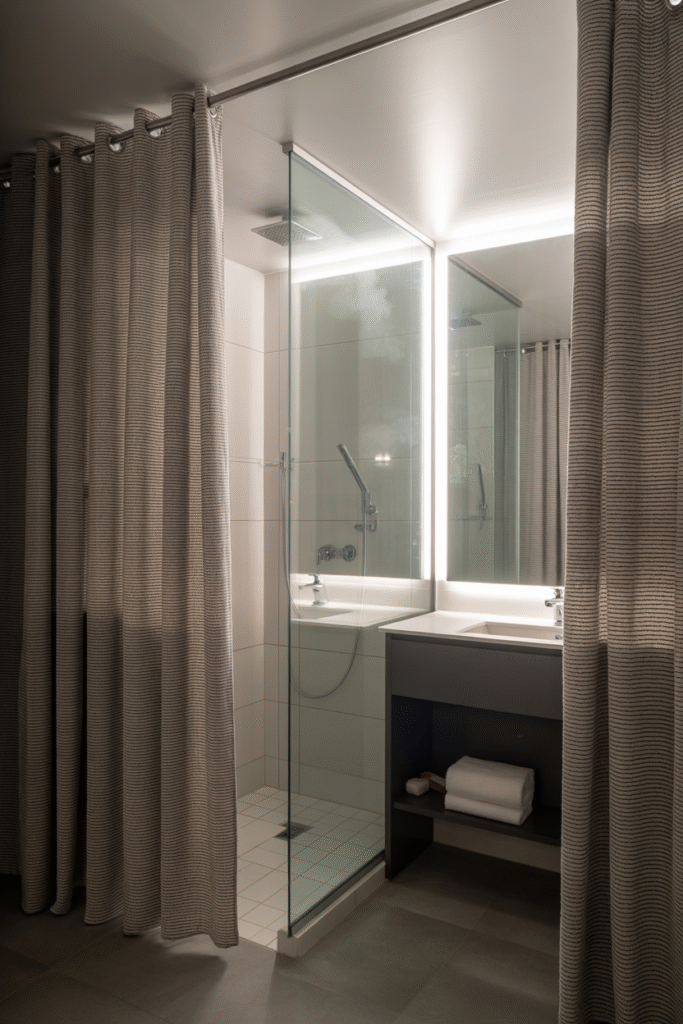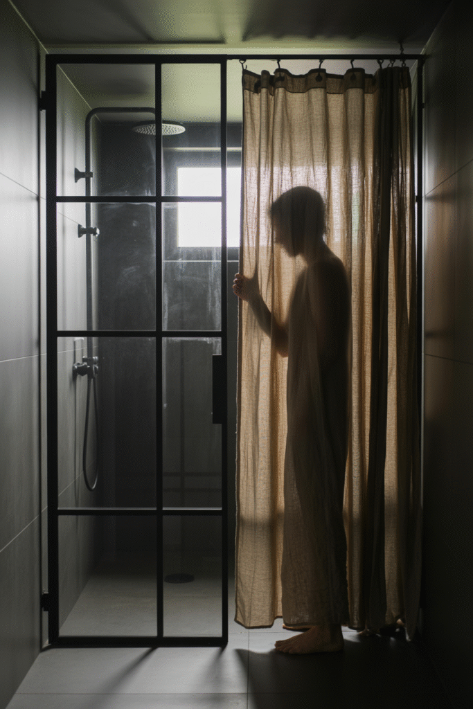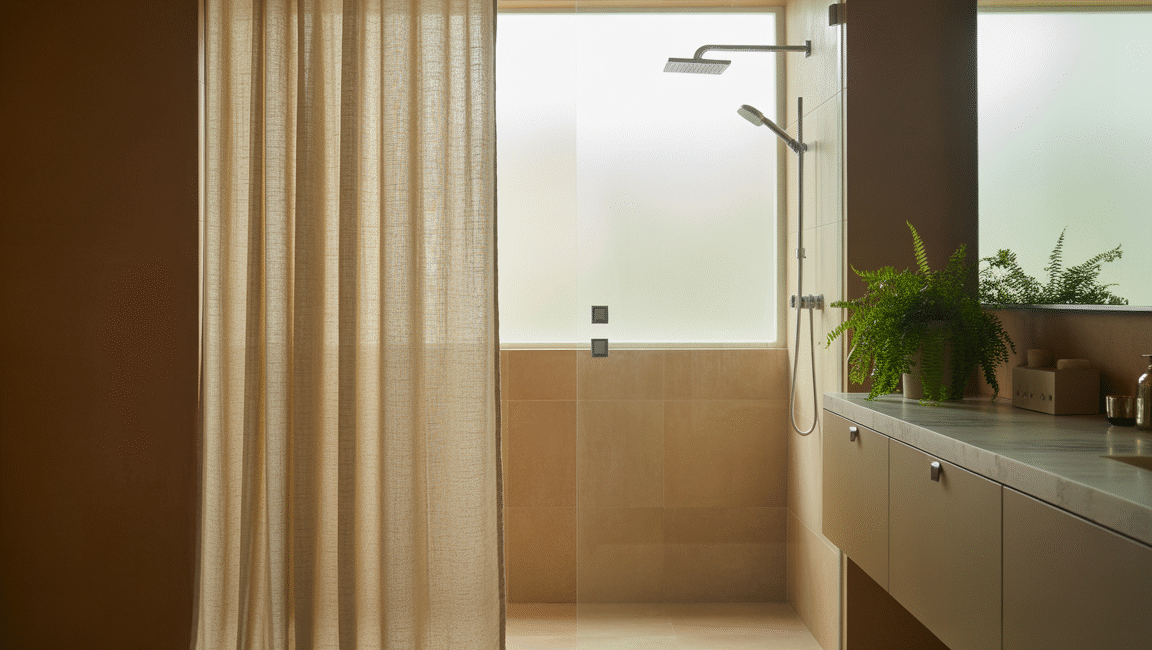 The beauty here is in the layering. The glass does the heavy lifting for water containment, so your curtain doesn’t need to be waterproof. You can choose materials based purely on how they look and feel. Linen wrinkles naturally, and that’s actually part of its charm—it softens all those hard surfaces (tile, glass, chrome) that dominate most bathrooms.