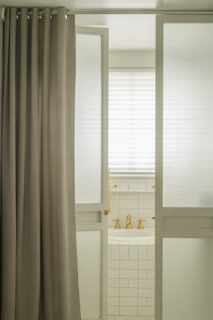 Privacy matters, especially in shared bathrooms. Frosted or textured glass provides constant screening while still allowing light to pass through. Pair it with a curtain in a similar weight and texture—maybe a waffle weave or a subtle jacquard pattern.