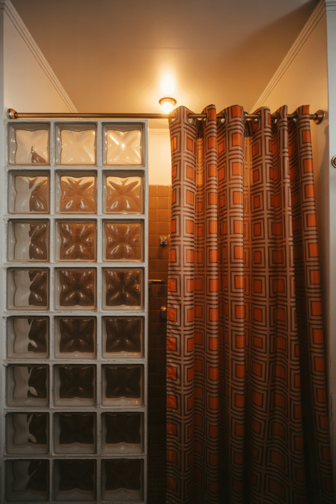Think mid-century patterns, 1970s earth tones, or even art deco geometrics. The textured quality of glass block and the pattern of a vintage-inspired curtain create a layered, collected-over-time feeling that’s inherently cozy.