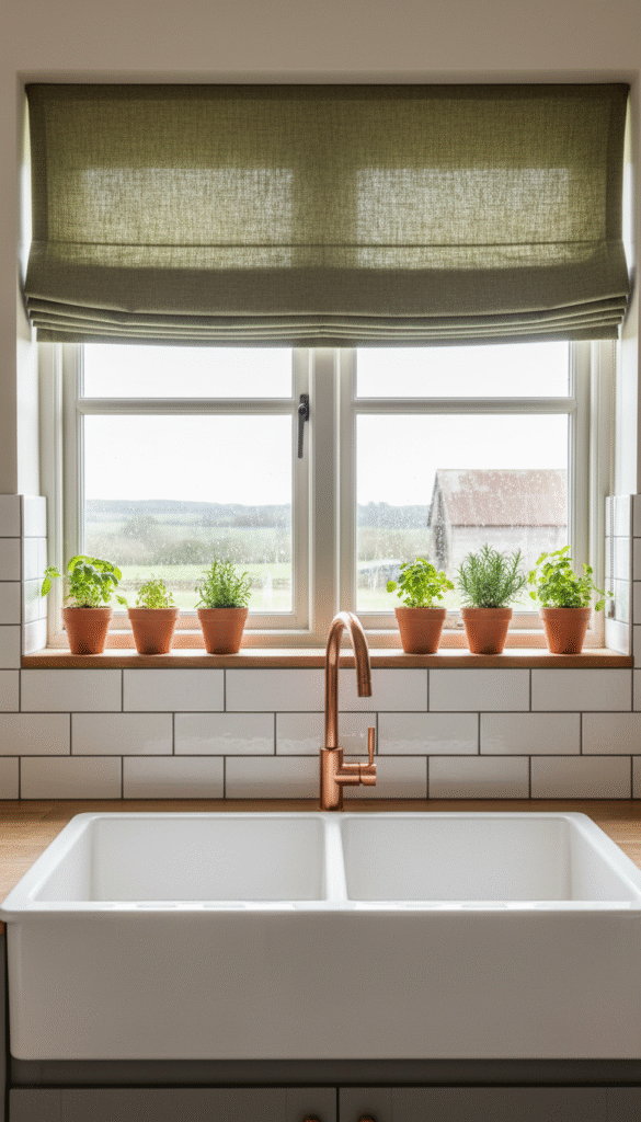 Not everyone wants floor-length fabric taking up space. Roman shades in olive green provide a tailored, clean appearance that looks custom-made. They are excellent for kitchens or bathrooms where long drapes might get in the way or pose a safety hazard.