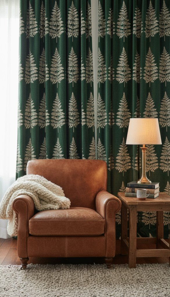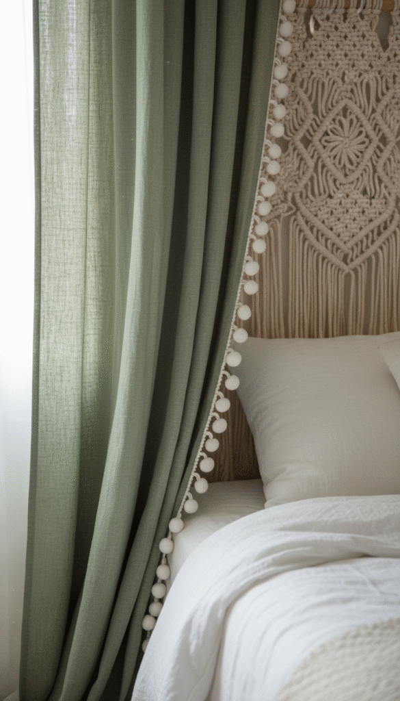 Playful details can soften the look of solid green drapes. A pom-pom or tassel trim adds texture and whimsy without being childish. This is particularly cute in nurseries, guest rooms, or boho living spaces that need a little personality.