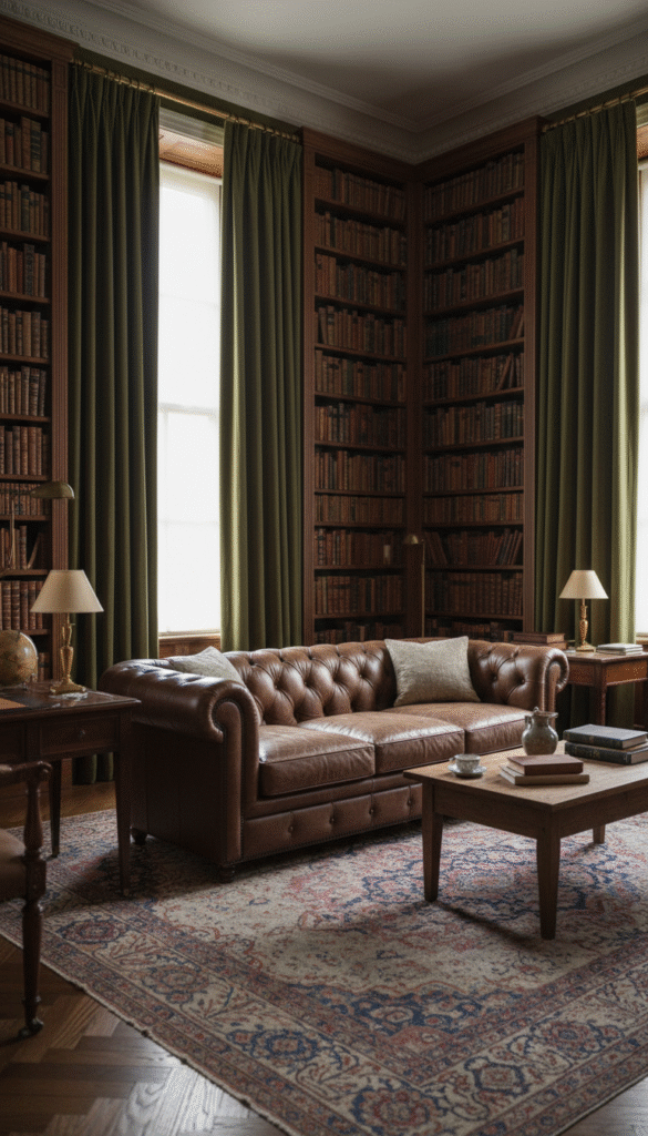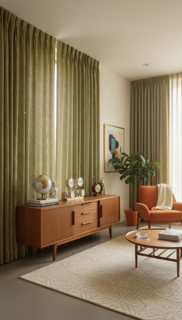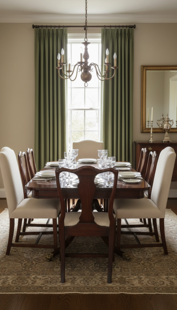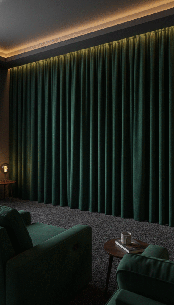 Mounting drapes at the ceiling line makes average ceilings feel grand and high. Olive velvet provides a vintage, moody atmosphere that feels cozy rather than imposing. This works wonders in dining rooms or libraries where you want to encourage lingering conversation.