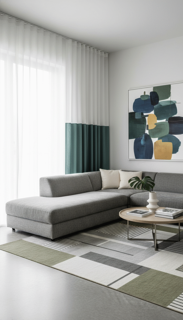 Color blocking adds a modern, geometric edge to window treatments. Mixing teal green with a neutral beige or white creates a striking visual break that draws the eye upward. It creates an illusion of height while adding a splash of vibrant color.