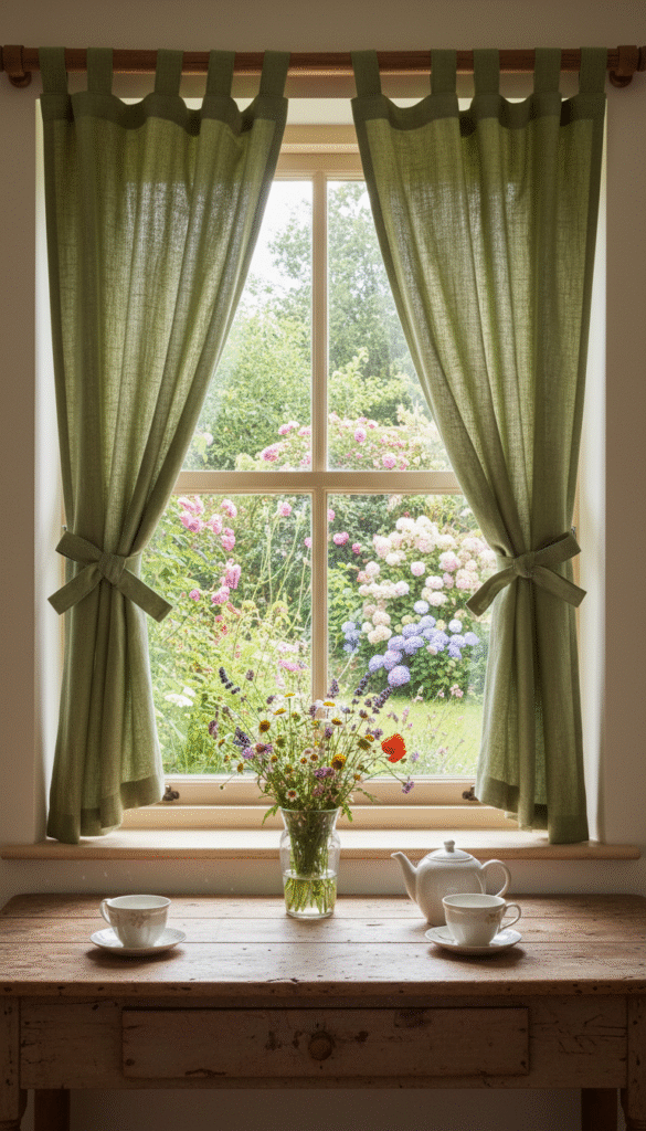 Tie-tops create a relaxed, cottage-core aesthetic that feels very approachable. The knots add a handmade, casual feel to the window treatment that standard hooks can’t replicate. Fern green feels fresh and lively, ideal for a kitchen or breakfast nook.