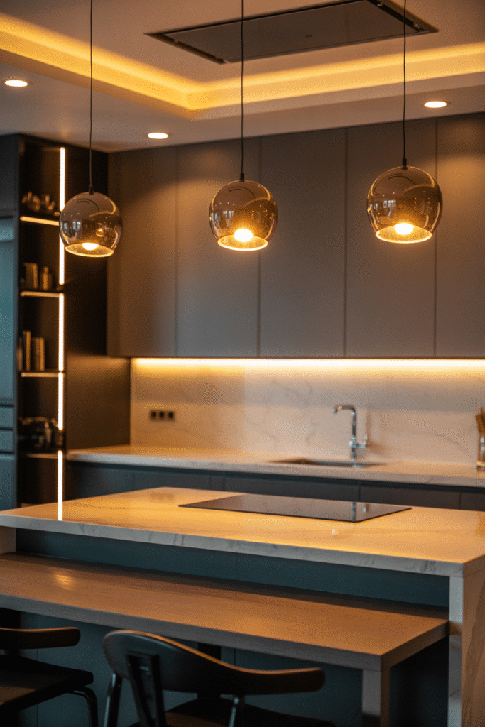Lighting has become an art form. In 2026, the focus is on layered illumination — combining recessed task lights, warm pendants, and soft under-cabinet LEDs.