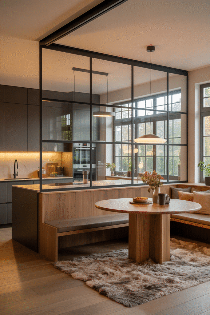 Why it works: It allows noise control, hidden prep areas, and a more intentional rhythm between cooking, dining, and living.