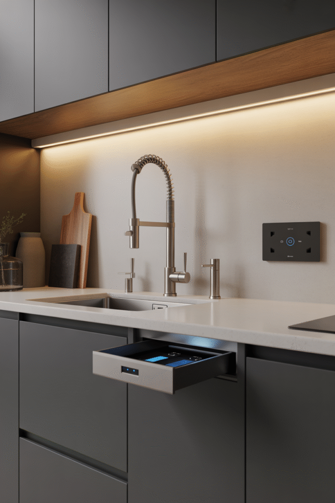 Forget flashy screens. The future of kitchen tech is discreet — voice-activated faucets, invisible charging drawers, and app-controlled lighting that blends in rather than showing off.