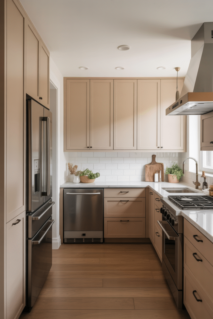 2026 color palettes are all about earth and emotion — think sand, clay, smoky blue, and olive paired with brass or black accents. Finishes lean matte, brushed, and tactile, giving even sleek kitchens a grounded, natural edge.
