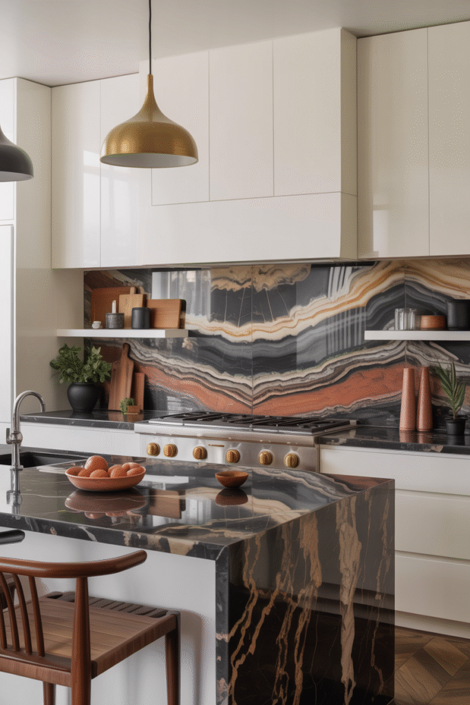 Why it works: Each slab becomes a piece of art, elevating even the simplest layout.