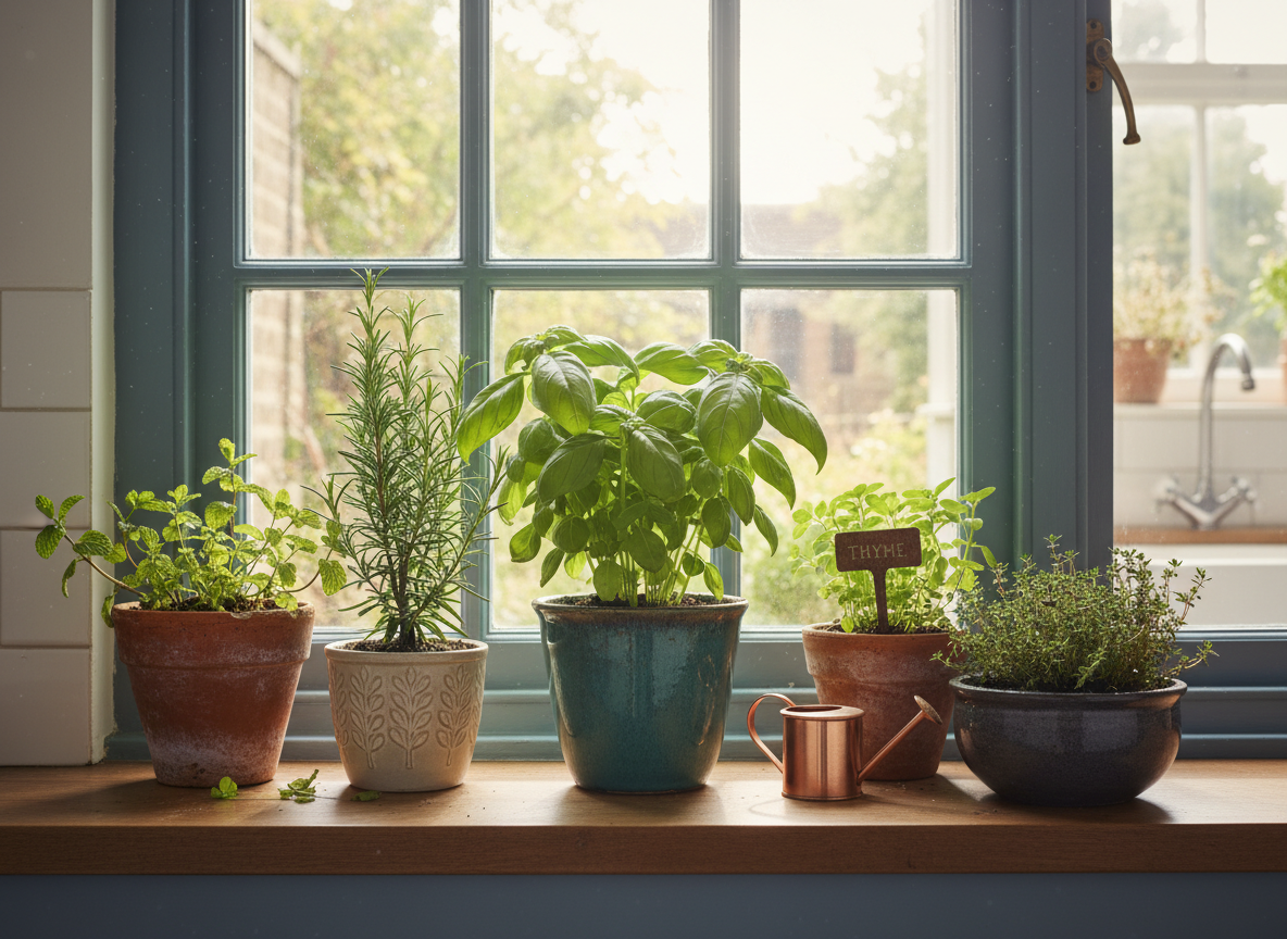 A mini herb garden is one of the most-loved kitchen window sill decor ideas for a reason: it looks beautiful and it works hard. Fresh basil, thyme, or mint at the window brings color and scent to a small space without eating precious counter space.