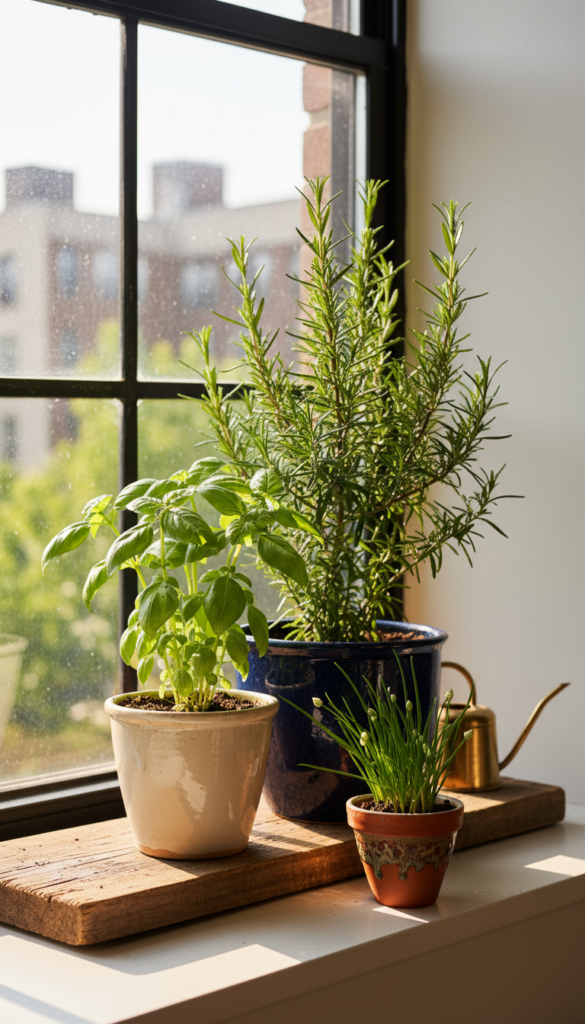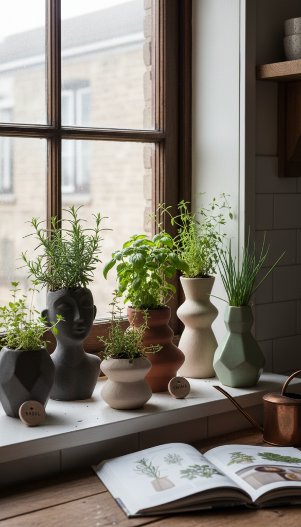 Choose small, sculptural pots instead of bulky planters. Think matte cream, speckled clay, or dusty sage ceramic with soft curves. Line up 3–5 petite herbs, or cluster them at one side of the sill so the rest stays visually light.