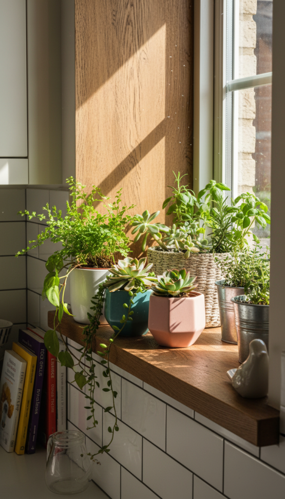 This idea fits beautifully into Kitchen Window Sill Decor for small spaces because every item earns its spot. Useful, beautiful, and easy to keep neat even when pots pile up nearby.
