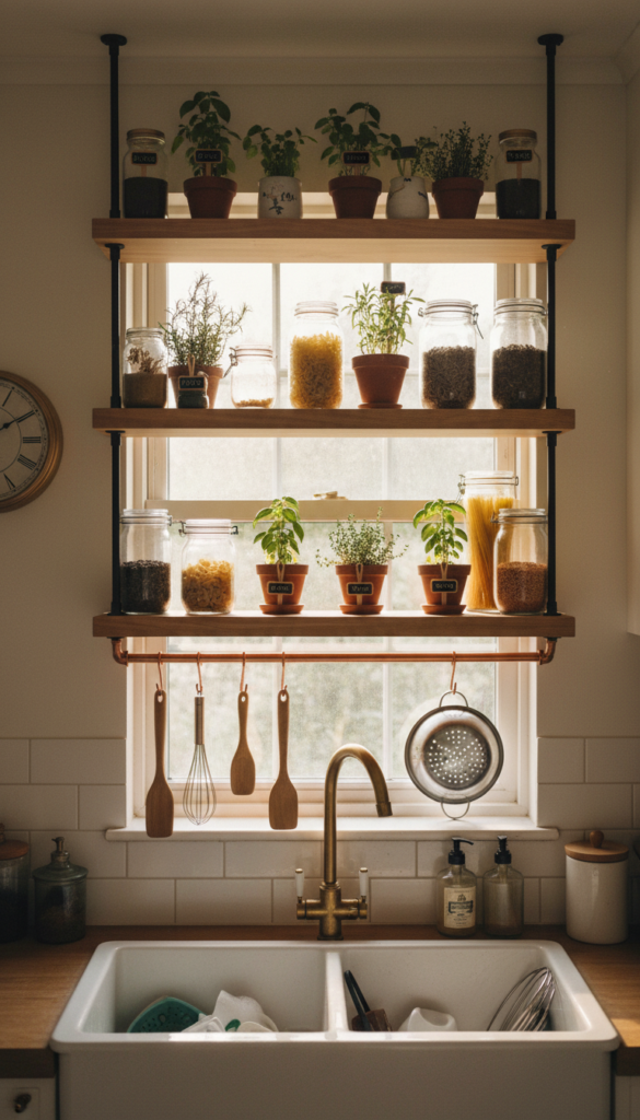For tiny kitchens, Kitchen Window Shelves are game-changing. These are slim, often clear or light wood shelves mounted across or just inside the window frame, giving you two layers of sill instead of one.