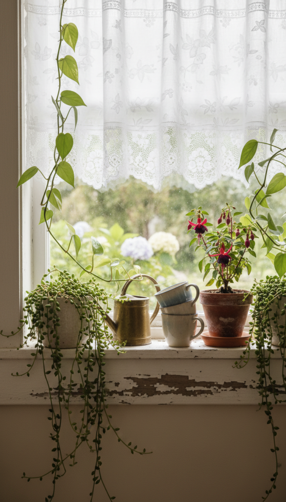 Sometimes the most magical window sill ideas kitchen are about what hangs, not what sits. A soft café curtain paired with trailing plants turns a small kitchen into a cozy, European-feeling nook.