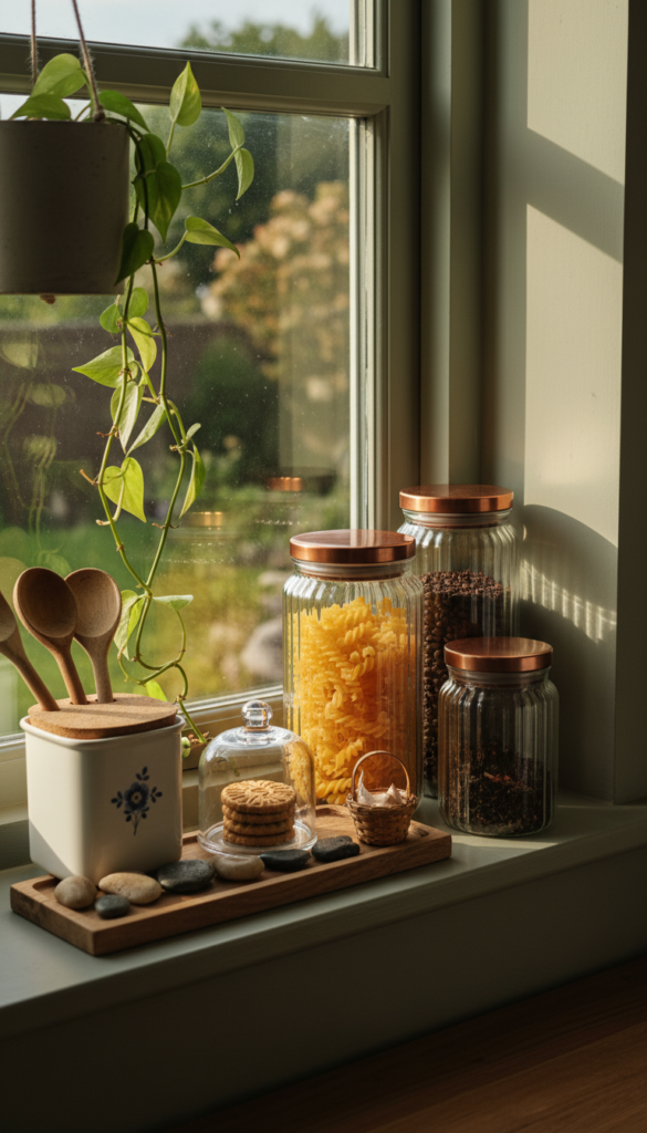 This idea turns practical storage into Kitchen Window Sill Decor that looks intentional and saves cabinet space at the same time.