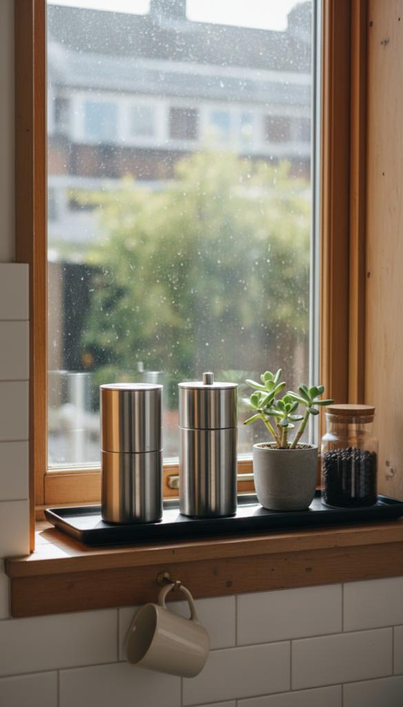 Pick a cozy palette, like warm caramel wood, ivory mugs, and a muted forest green jar. It looks intentional but still calm. Keep everything low-profile so it does not block the view or bump into the window handle.