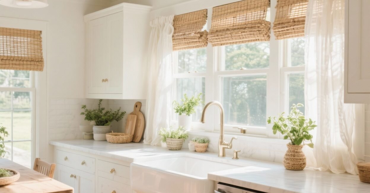 If you’re craving warmth and texture, woven wood shades are your best friend. They add natural tones that play perfectly with stone counters, painted cabinets, and stainless appliances.