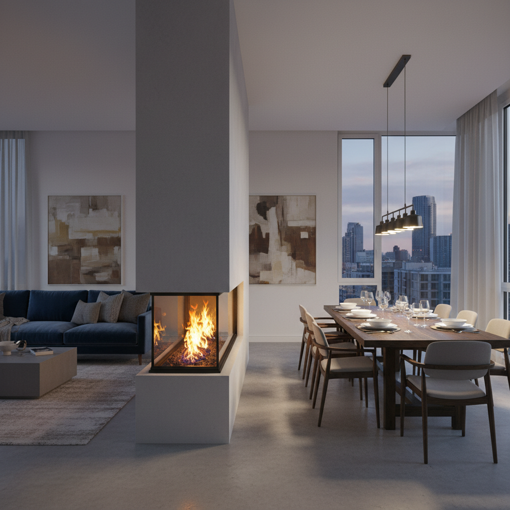 A centrally located fireplace unit can serve as an elegant and functional partition, dividing living and dining areas with warmth and style. Double-sided fireplaces offer visual appeal and heat to both adjacent spaces.