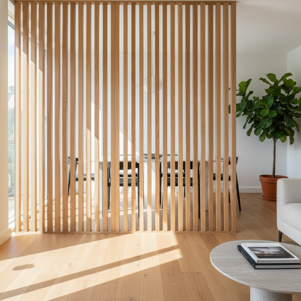 Slatted wood screens divide spaces while preserving light and visual flow throughout the interior. The vertical gaps create separation without the heaviness associated with traditional solid walls.
