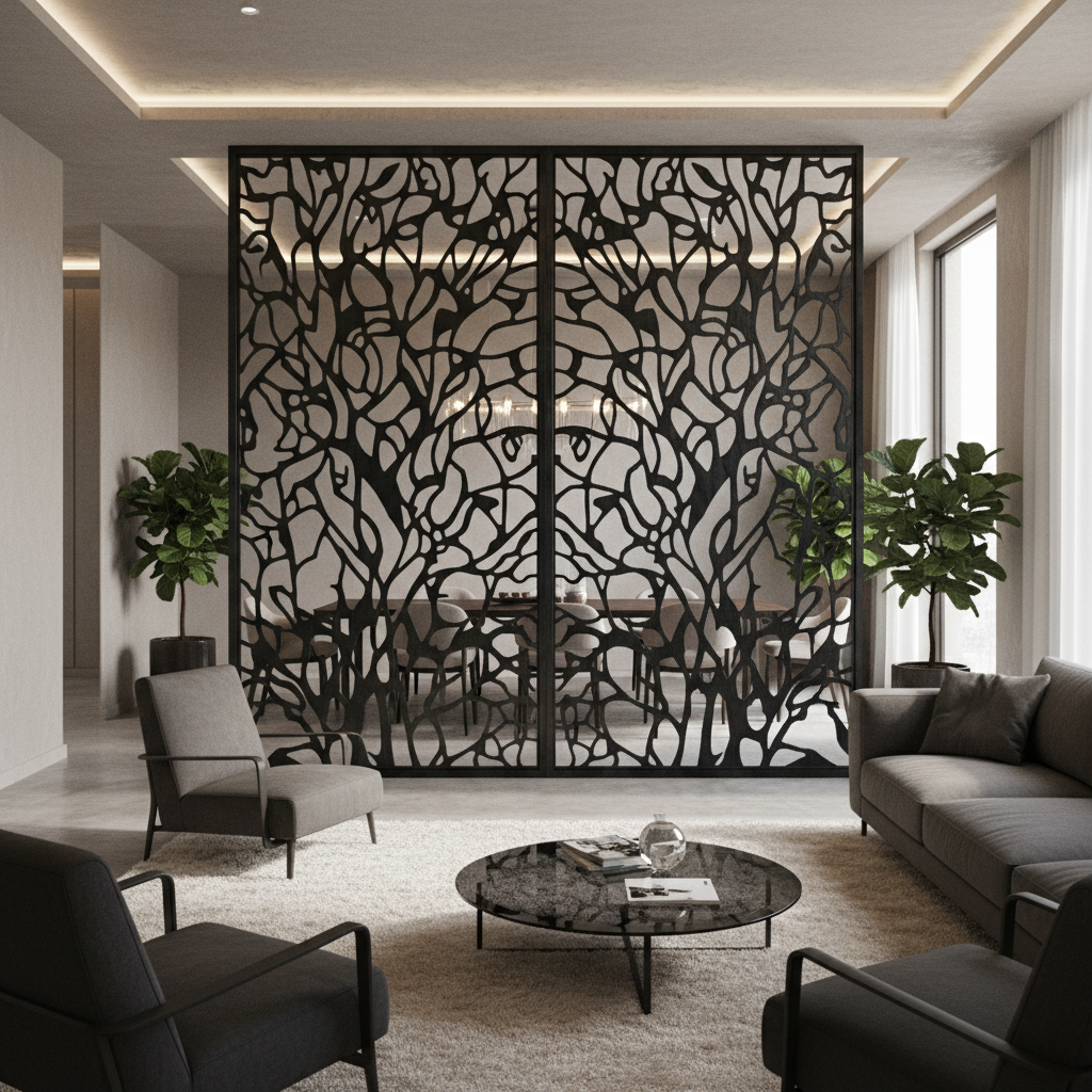 Laser-cut or intricately designed decorative panels offer artistic flair while providing a semi-transparent partition between rooms. These unique elements introduce pattern and texture, becoming a sculptural feature.