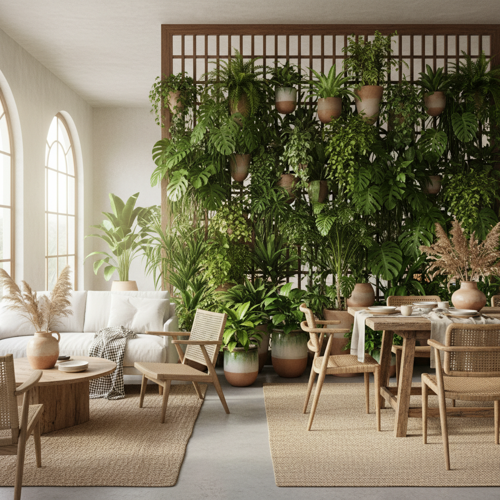 Strategically placed tall planters with lush foliage naturally delineate areas, adding organic texture and a sense of tranquility. This eco-friendly option provides a beautiful, breathable barrier between living and dining zones.