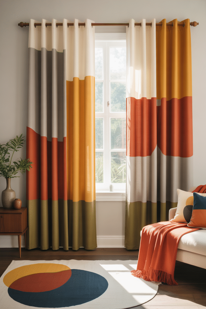 7) Color-Blocked Curtains (A Little Retro, Not Theme-Park)