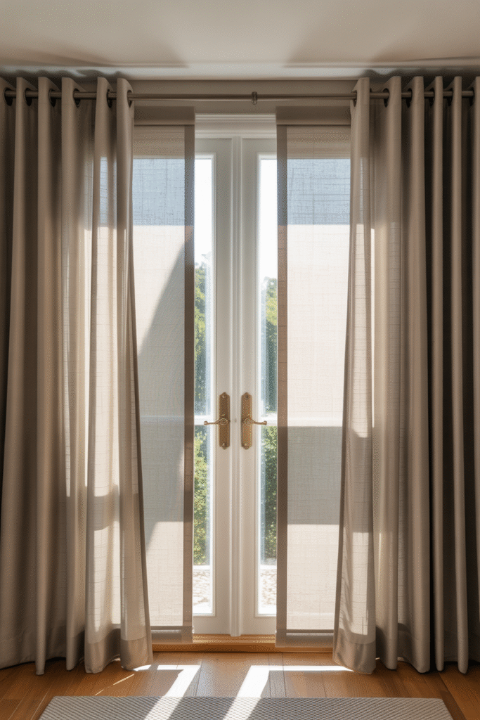 You want sunlit rooms but also true darkness for sleeping or movie night. Layering a blackout roller close to the glass with sheer panels on the room side gives you both.