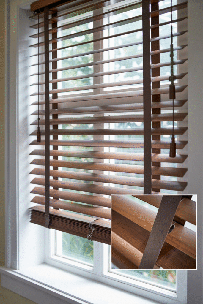 - Wood blinds: Dust weekly with a microfiber paddle; avoid soaking cords and slats.